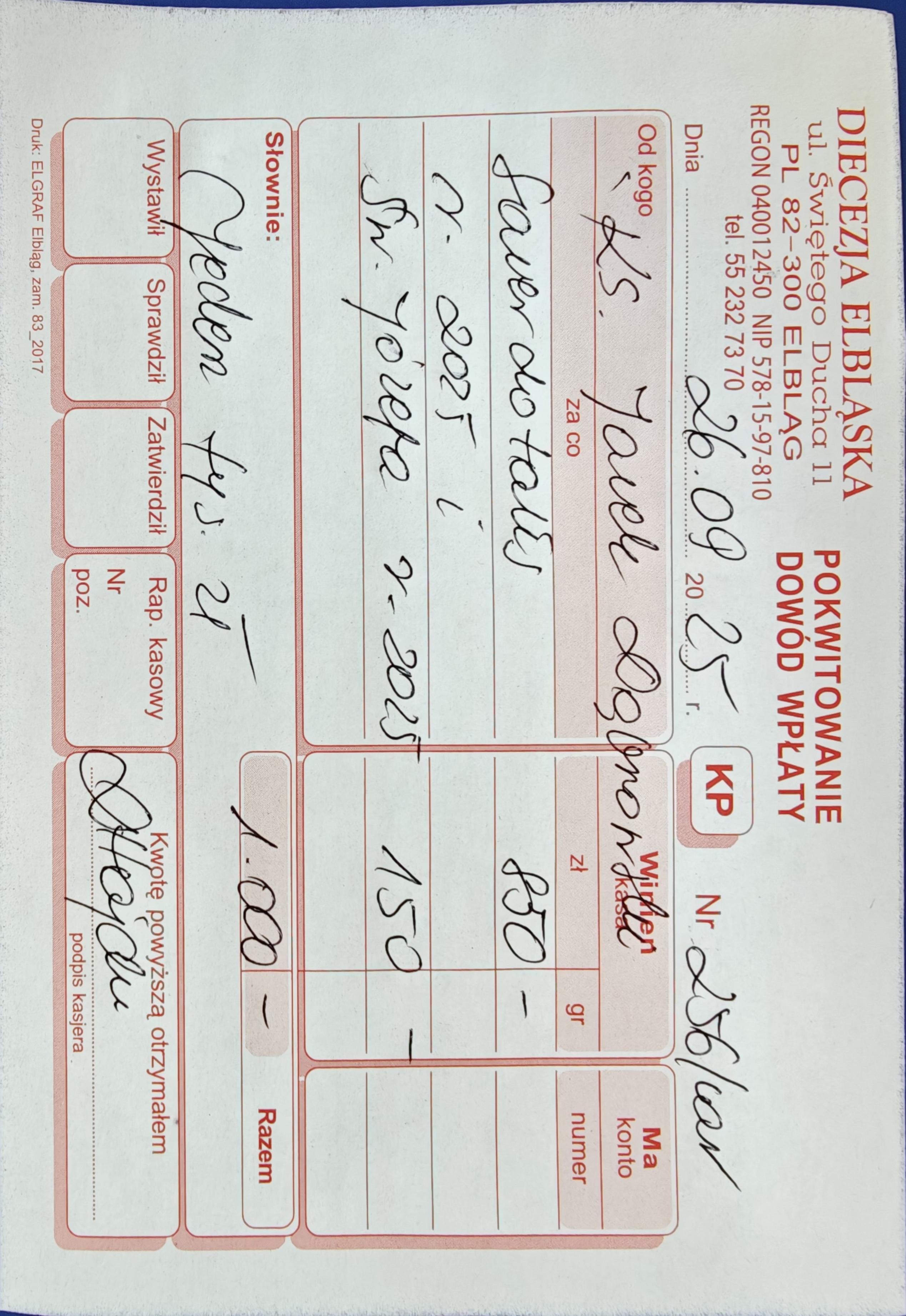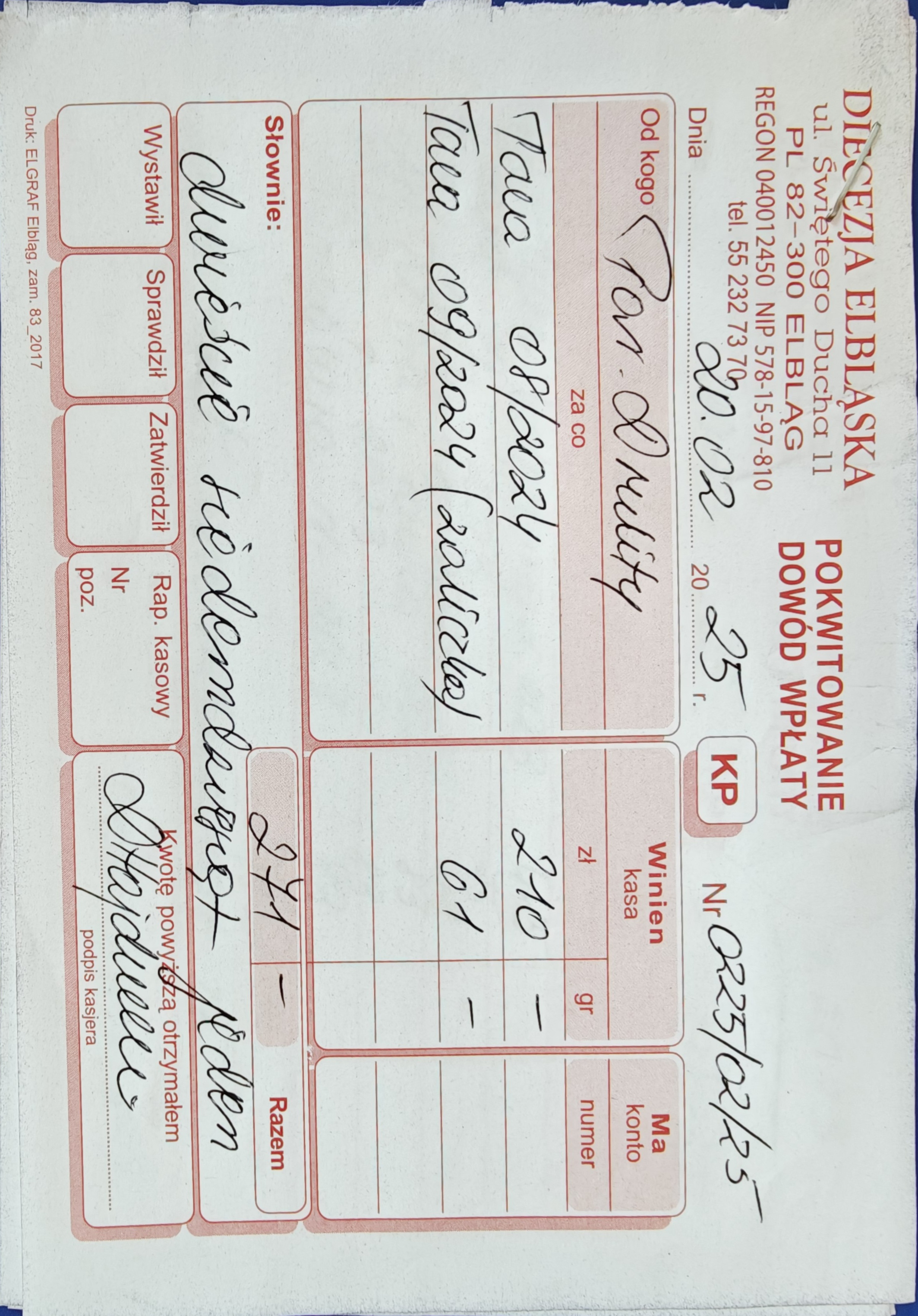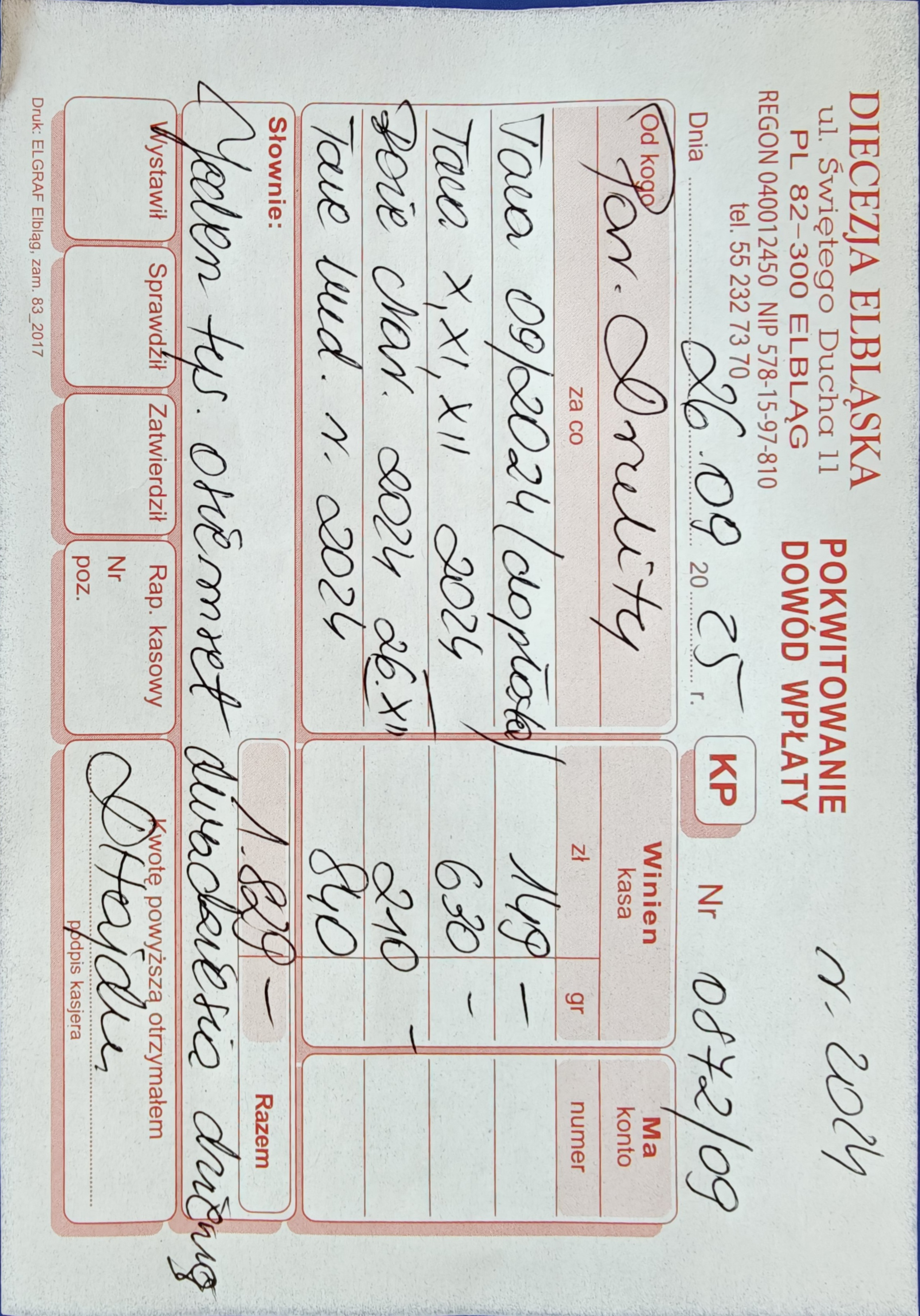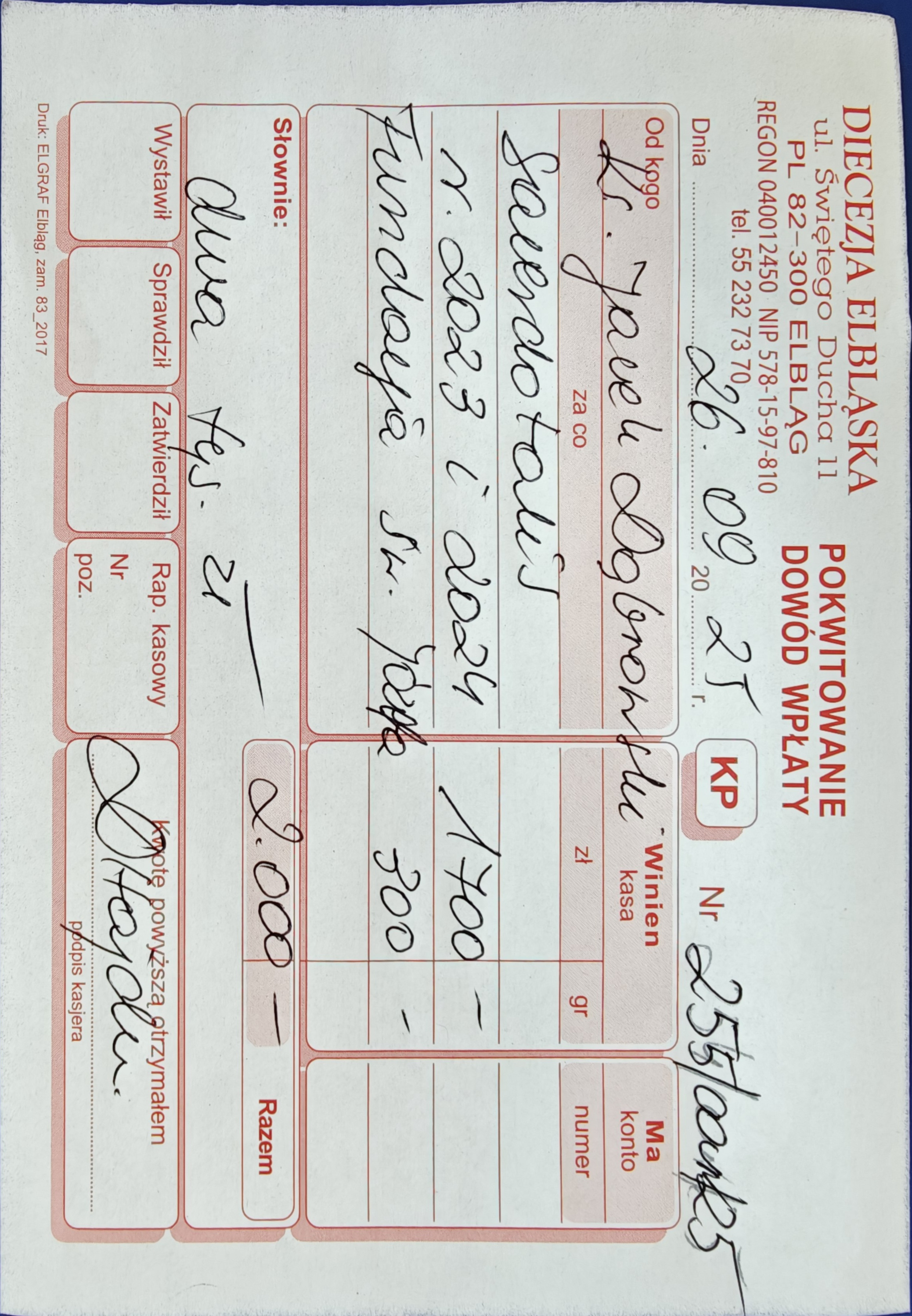 15 078 zł - (Kuria Diecezji Elbląskiej + Caritas Diecezji Elbląskiej + Wyższe Seminarium Duchowne Diecezji Elbląskiej) 2524 zł - Urząd Skarbowy (Podatek dochodowy) RAZEM = 17 602 zł