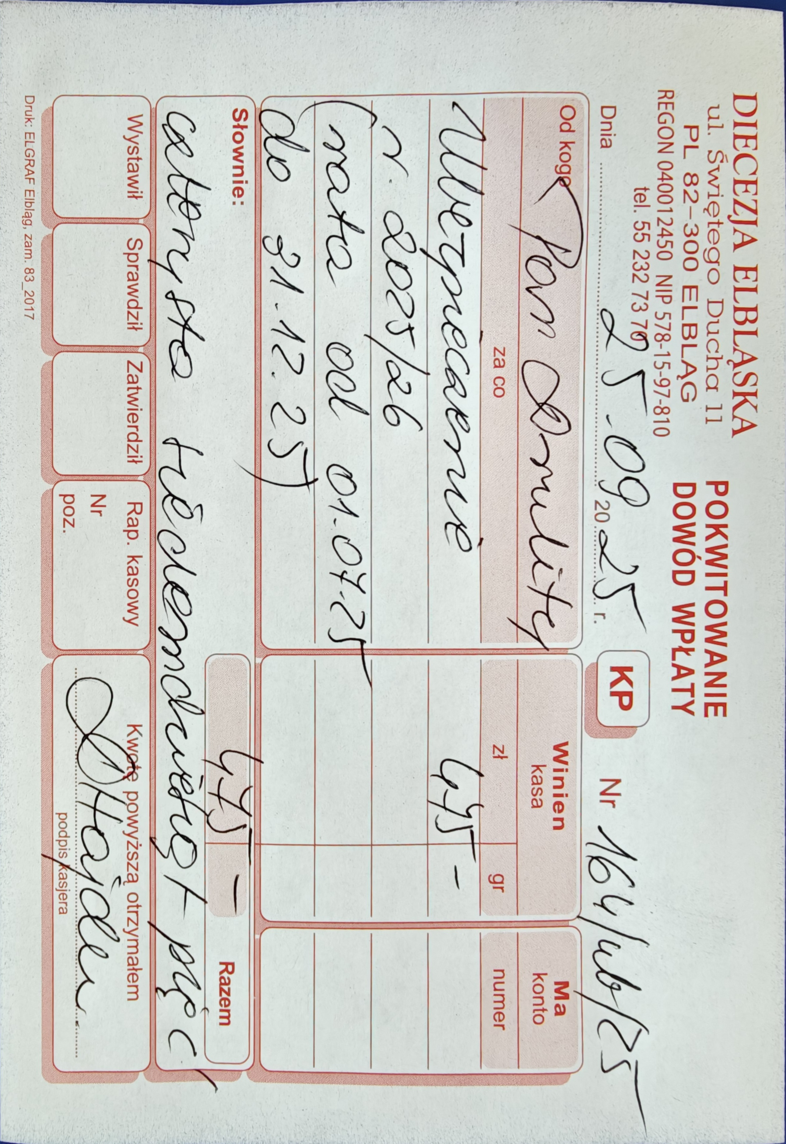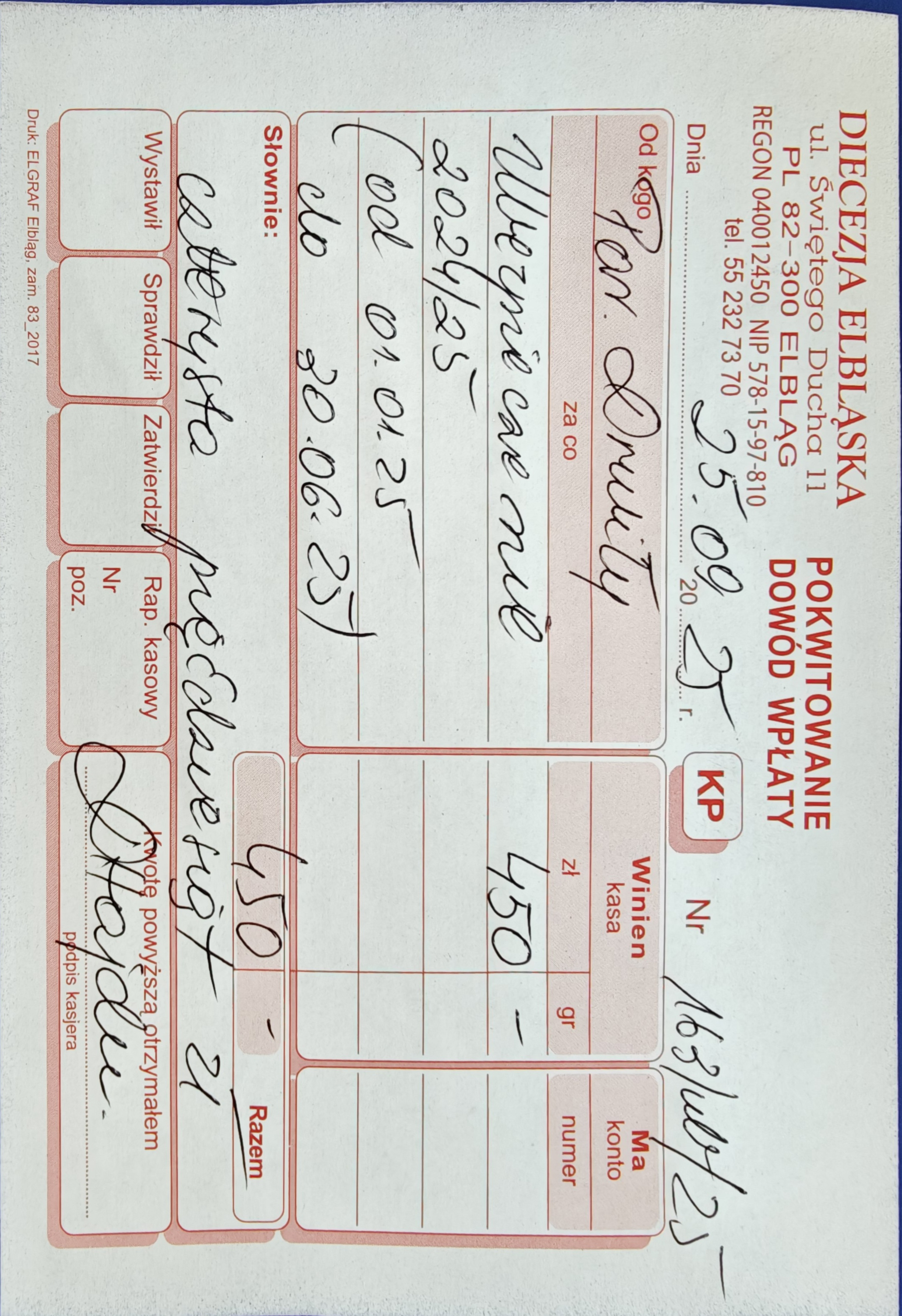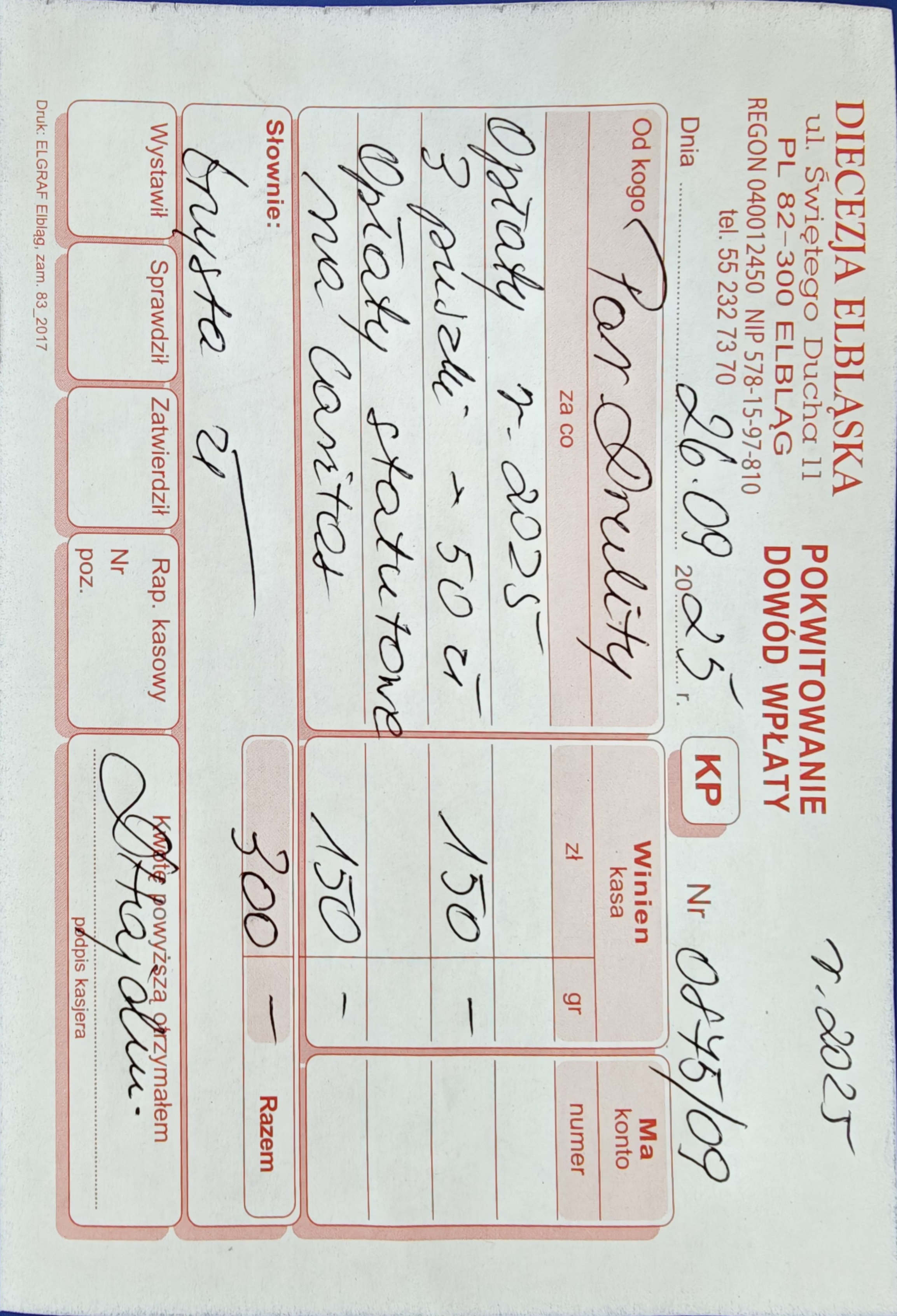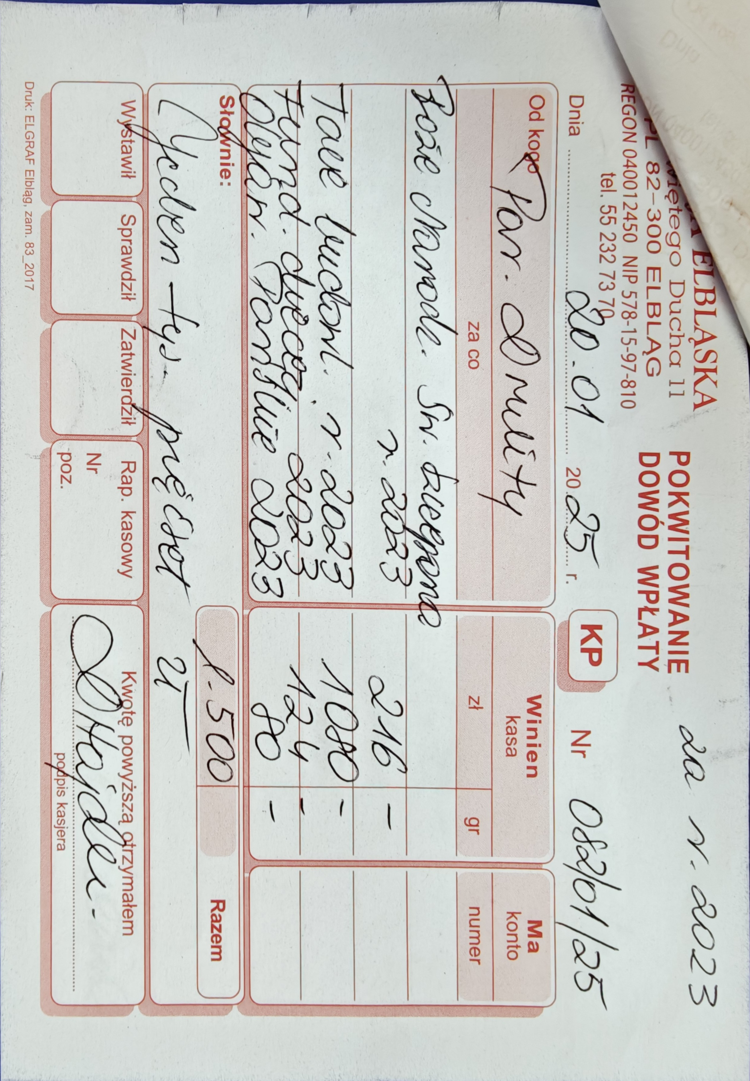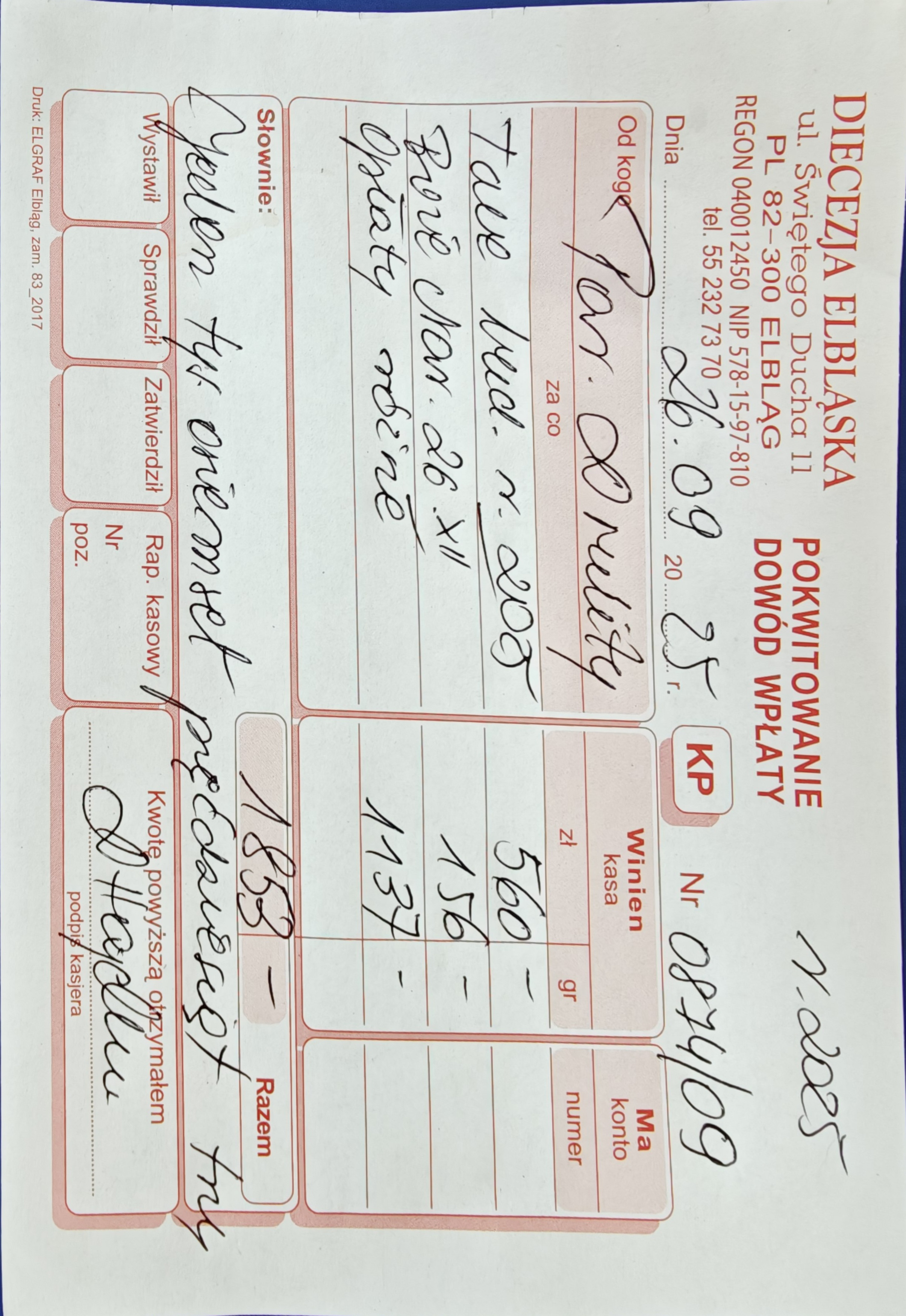15 078 zł - (Kuria Diecezji Elbląskiej + Caritas Diecezji Elbląskiej + Wyższe Seminarium Duchowne Diecezji Elbląskiej) 2524 zł - Urząd Skarbowy (Podatek dochodowy) RAZEM = 17 602 zł