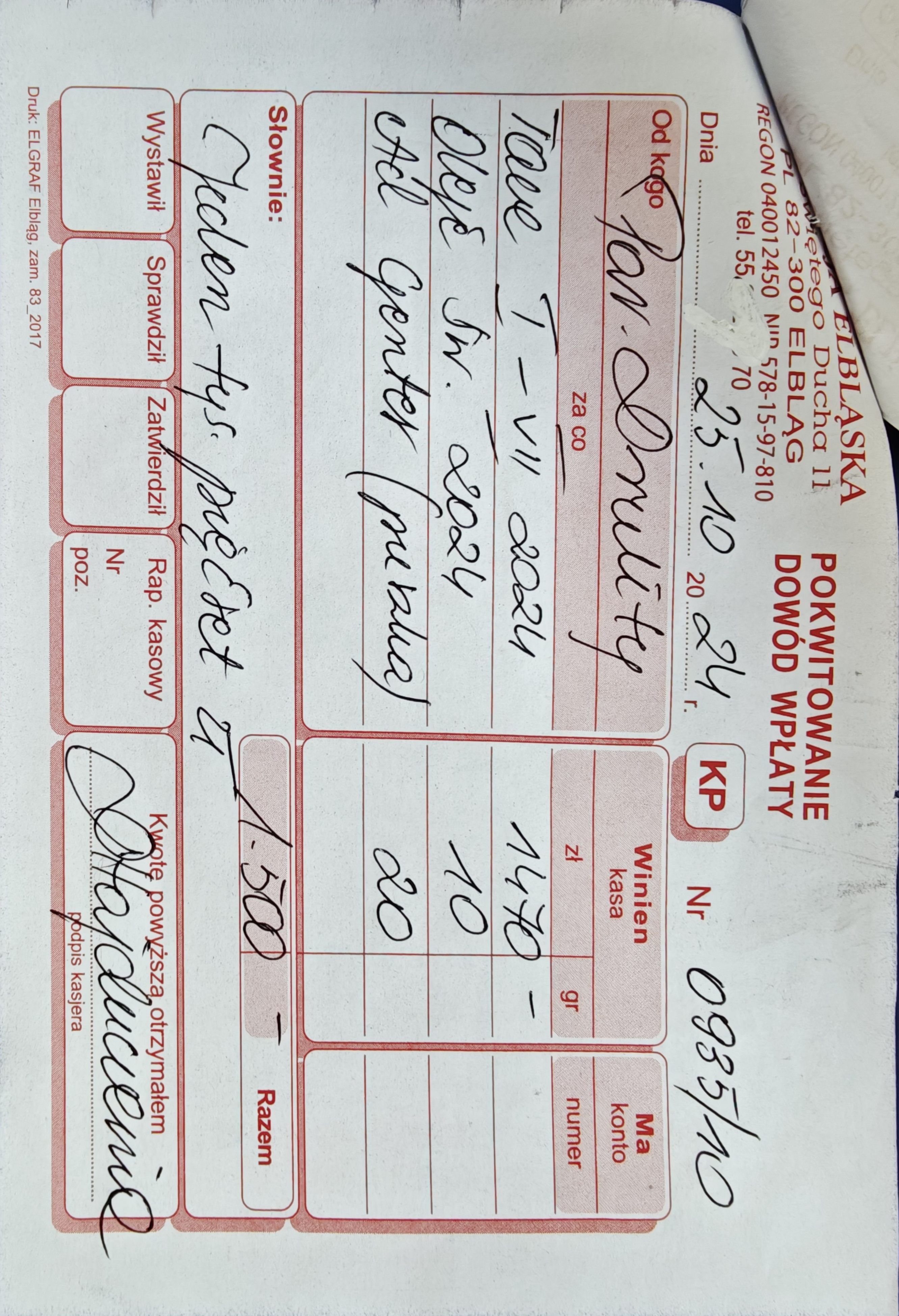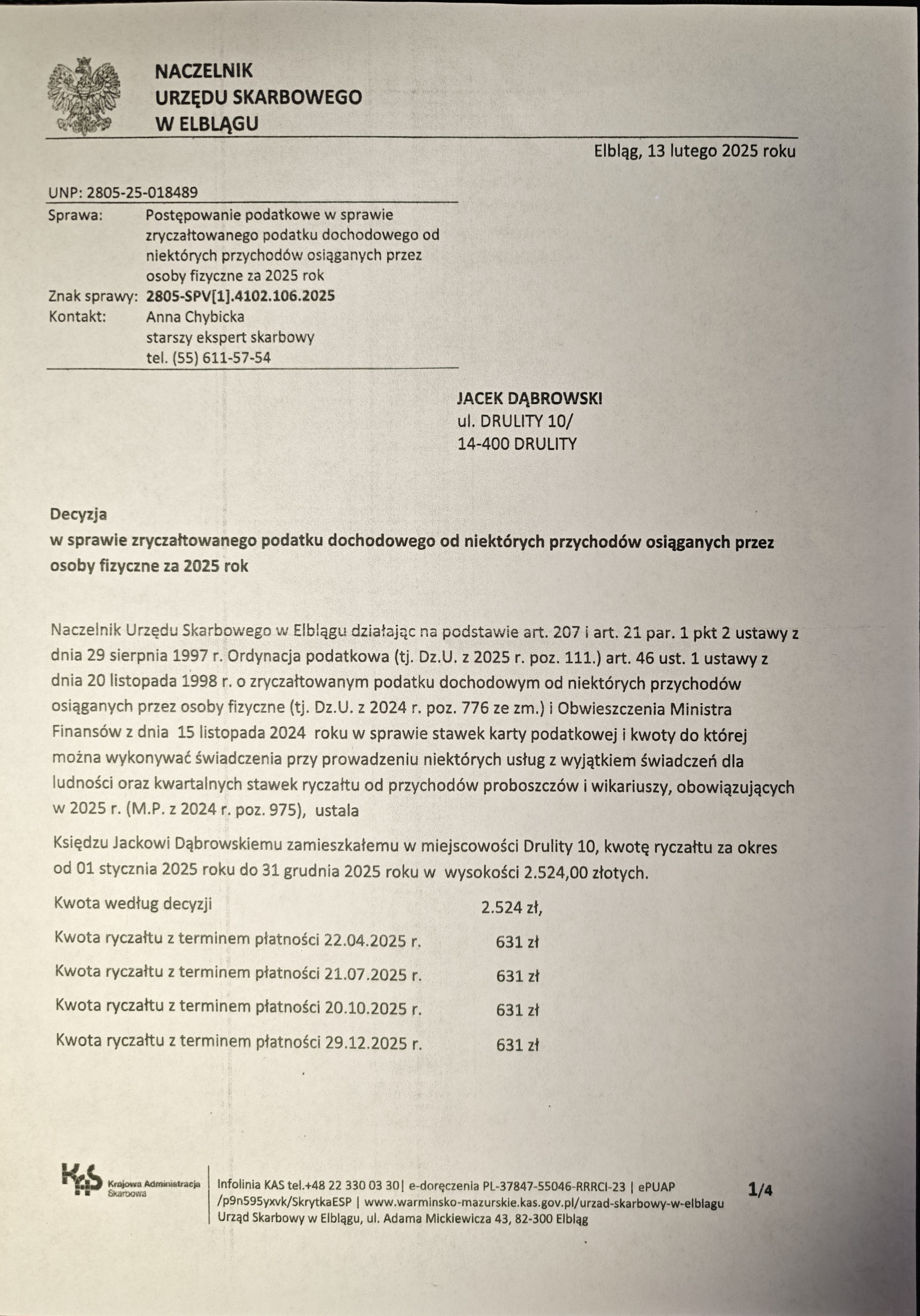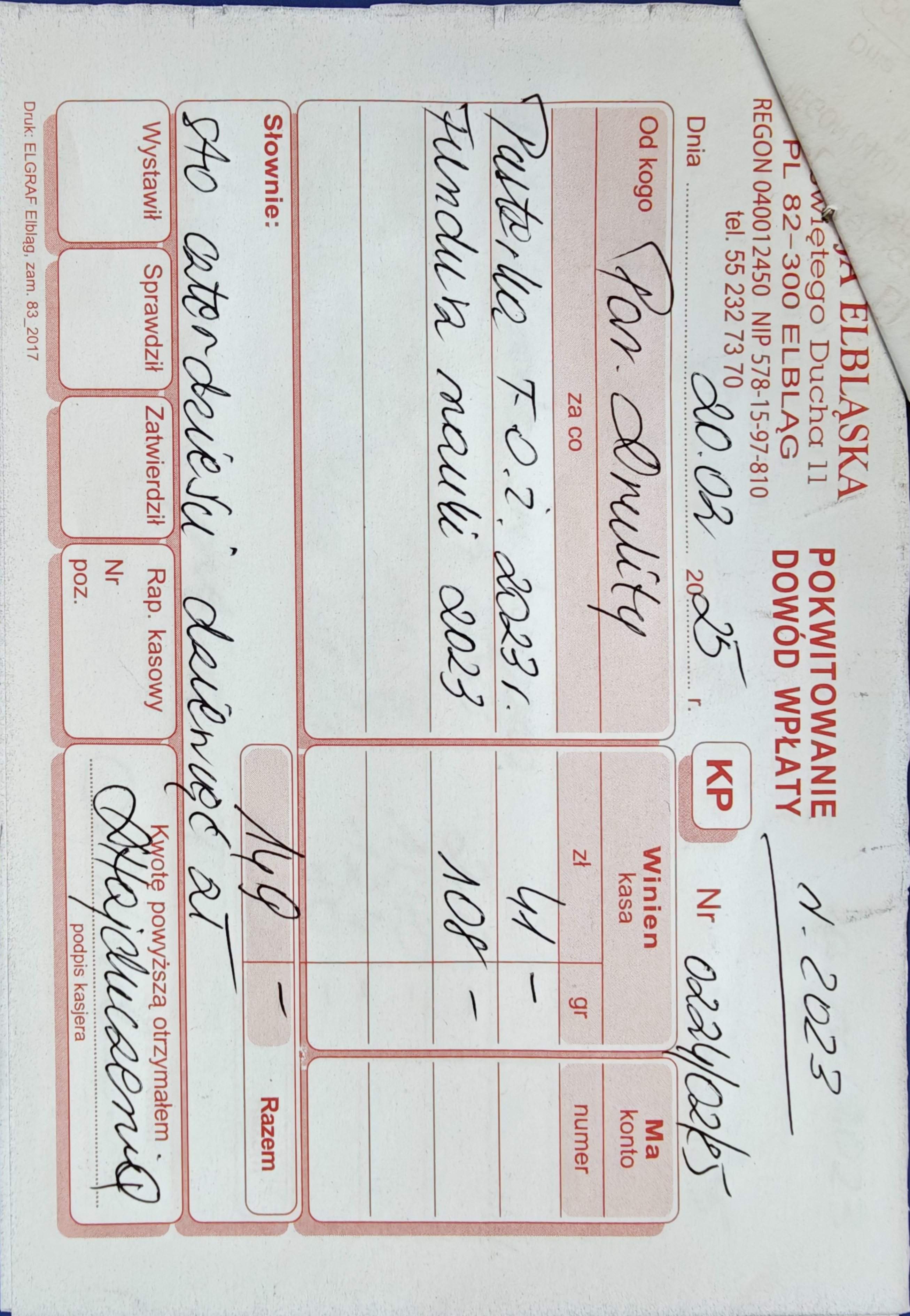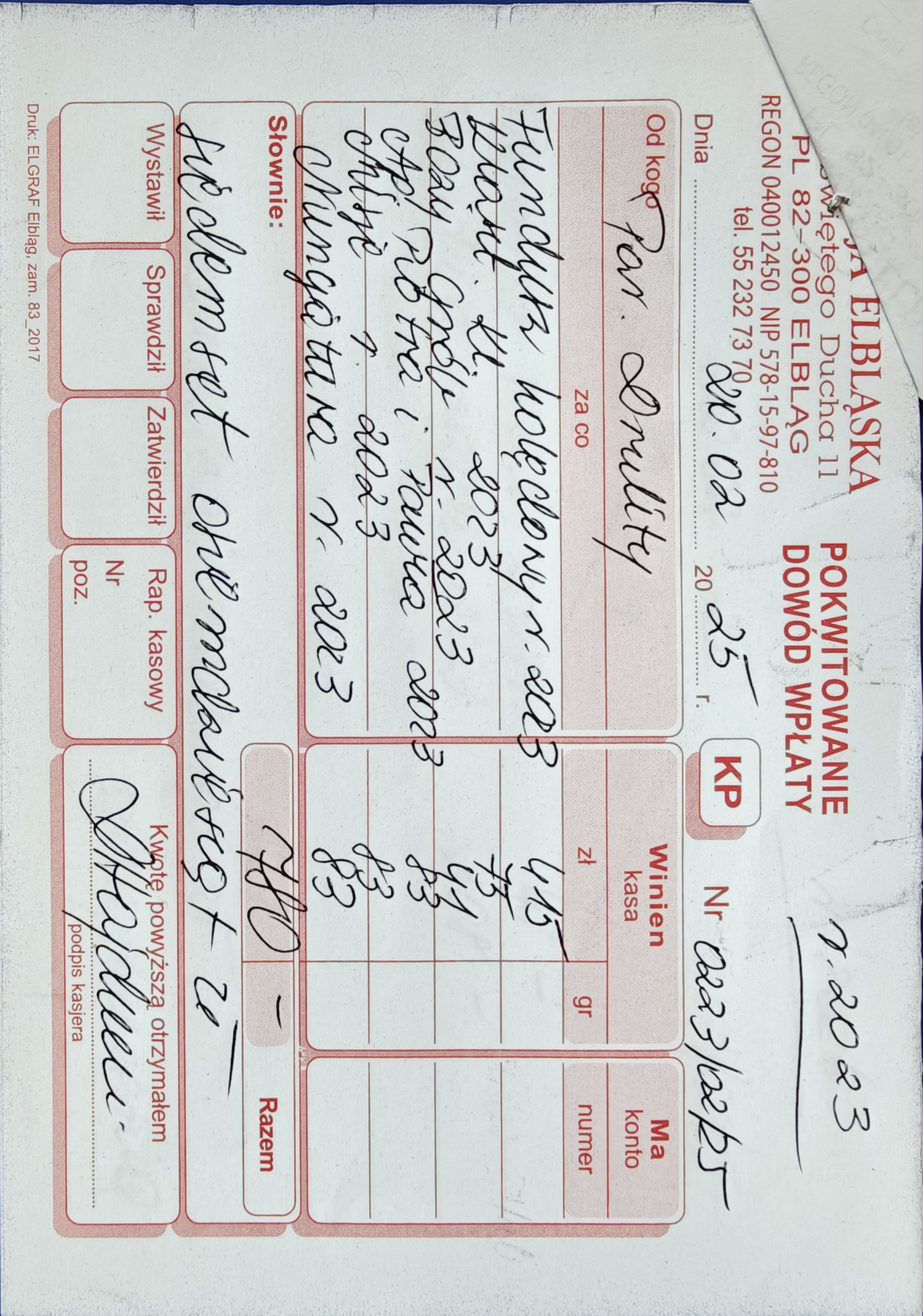 15 078 zł - (Kuria Diecezji Elbląskiej + Caritas Diecezji Elbląskiej + Wyższe Seminarium Duchowne Diecezji Elbląskiej) 2524 zł - Urząd Skarbowy (Podatek dochodowy) RAZEM = 17 602 zł